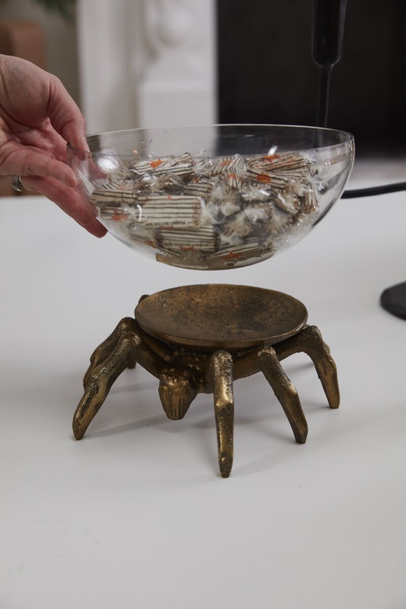 Spider phobics beware, the gold metal spiders of the Arachnid Terrarium are quite oversized, perfect for spooking guests all year long. Removable glass vessels on top of the metal spider bases are ideal for spooky plantings or tasty treats.