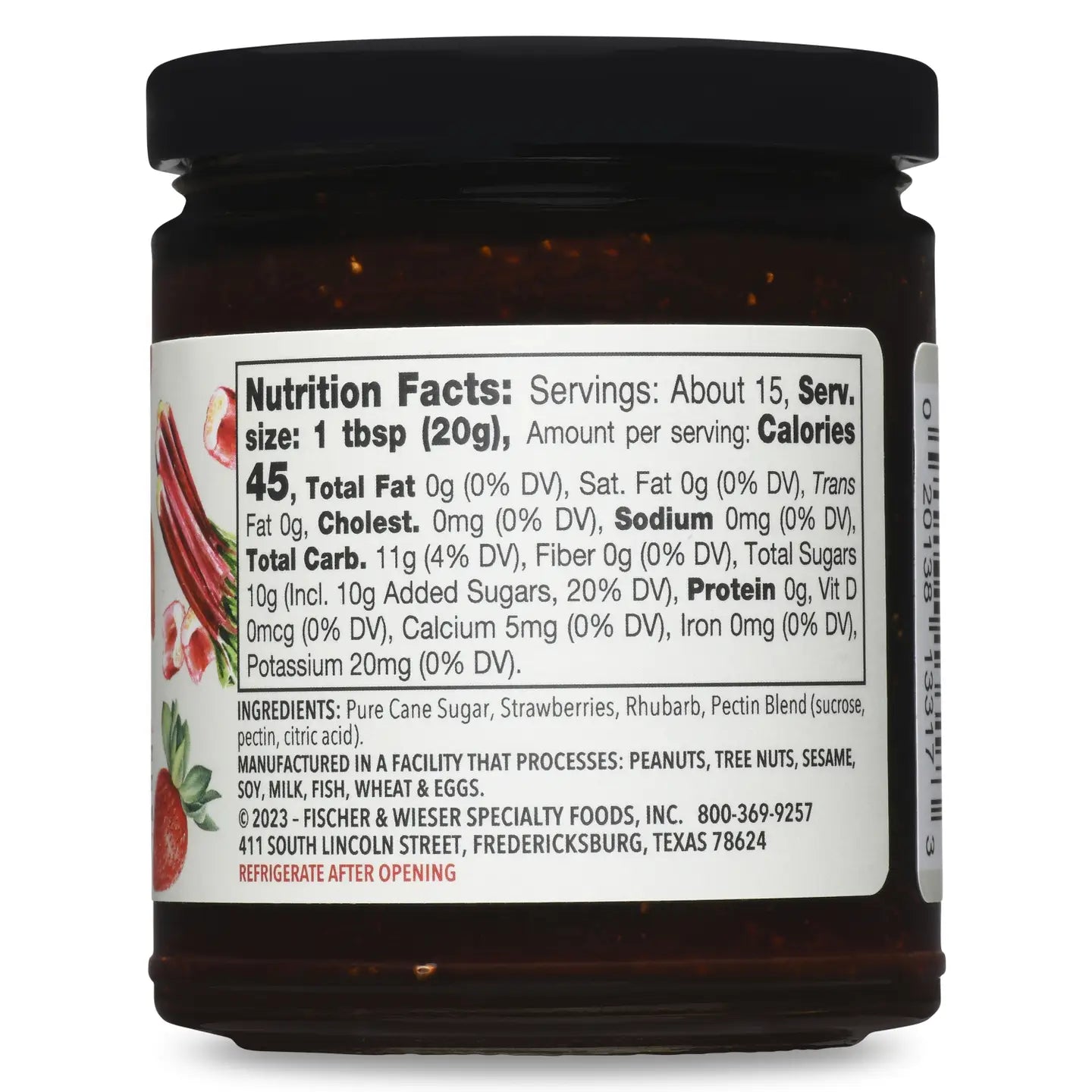 • Made in United States • Ingredients: INGREDIENTS: Sugar, Strawberries, Rhubarb, Pectin Blend (sucrose, pectin, citric acid)